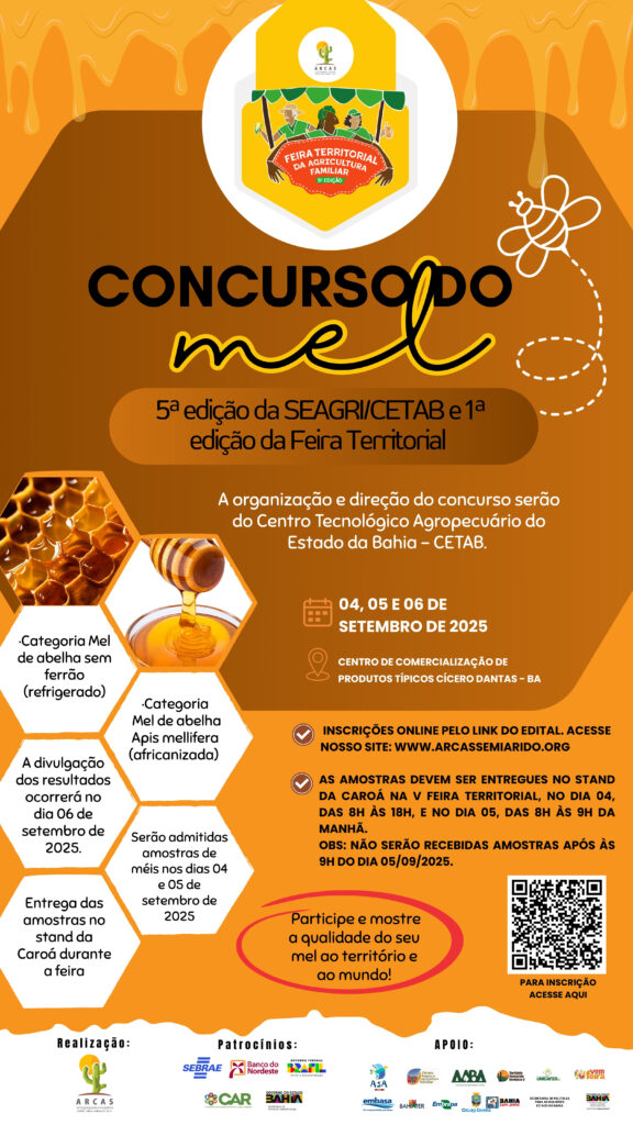 Como parte da programação da V Feira Territorial da Agricultura Familiar do Semiárido Nordeste II, ocorrrerá o 5º concurso de mel da SEAGRI/CETAB, primeiro da 5ª Feira Territorial da Agricultura Familiar. O concurso tem como objetivo estimular apicultores e meliponicultores a produzirem mel de qualidade com base nas análises laboratoriais; valorizar o profissional produtor de mel; oportunizar aos apicultores a divulgação da qualidade do seu produto; popularizar os produtos oriundos das abelhas e instigar a apicultura e meliponicultura racional e tecnológica.
